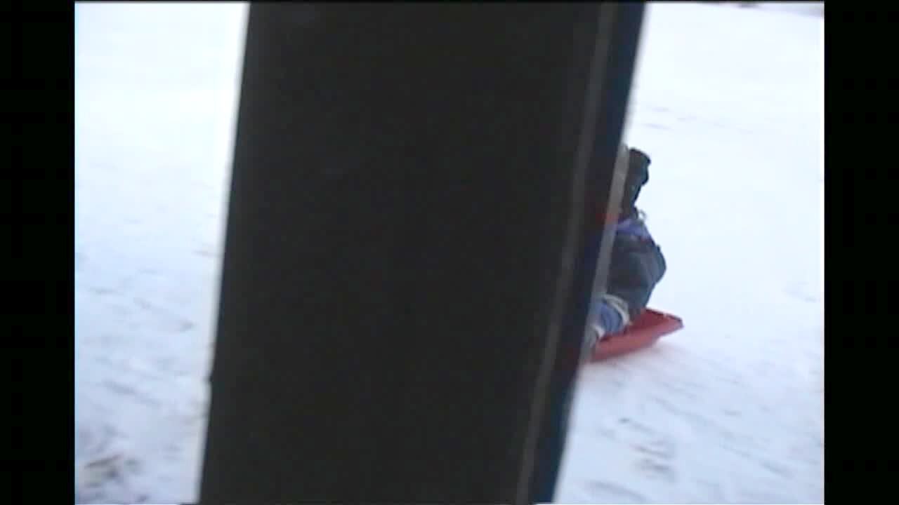 Boy sleds down icy hill very fast & crashes into car, sliding under it. Good sound. With recovery - boy pokes his head out laughing hysterically.