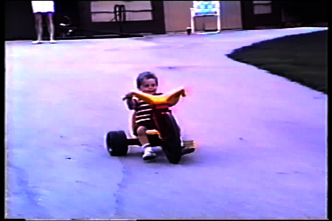 A young boy pops a wheelie on Power Wheels battery-powered car then drives out onto a road. His dad chases after him and the boy lets out an evil cackle at the end of video.