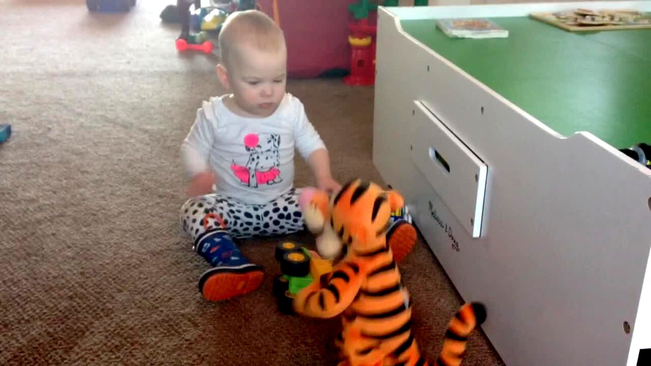 A baby girl points to parts of her body when her mom asks where they are and when her mom asks where her cheeks are, the girl reaches for her butt.