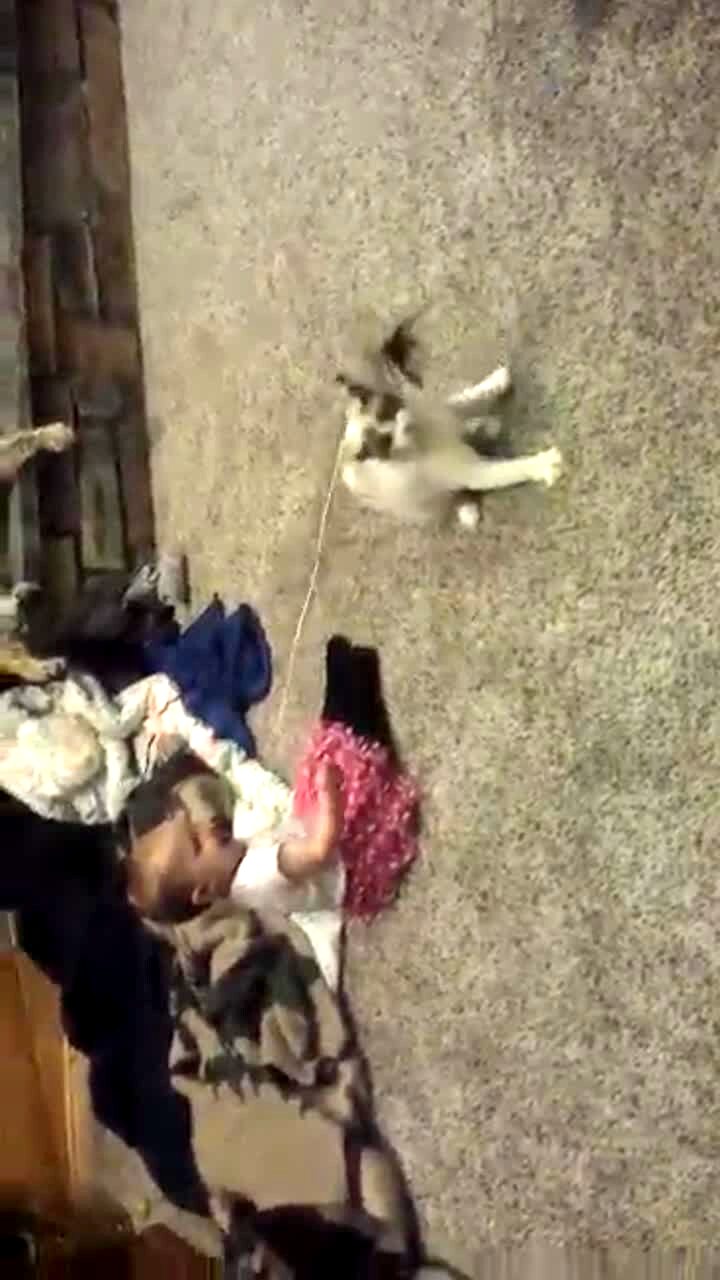 A baby tot girl waves a cat toy indoors and laughs as a cat chases it until the cat pounces and knocks the baby over.