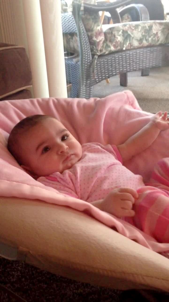 Baby girl makes a stink eye face on command from mom. She squints her face up and looks like Popeye.