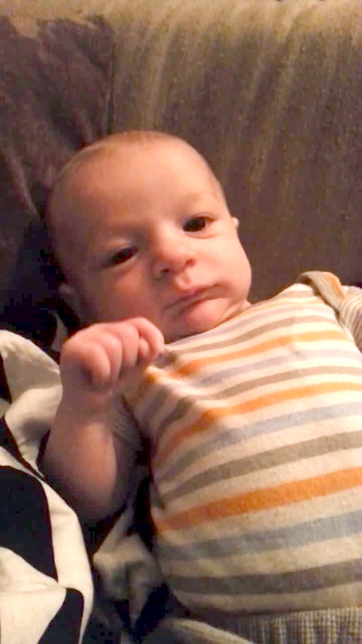 A baby boy's eyes go wide when his mom makes space noises at him indoors.