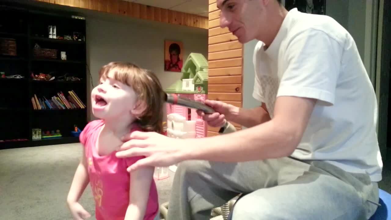 A man sits on a couch in the living room and a young girl rubs his shaved head with a brush. She says "daddy, your hair needs more hair."