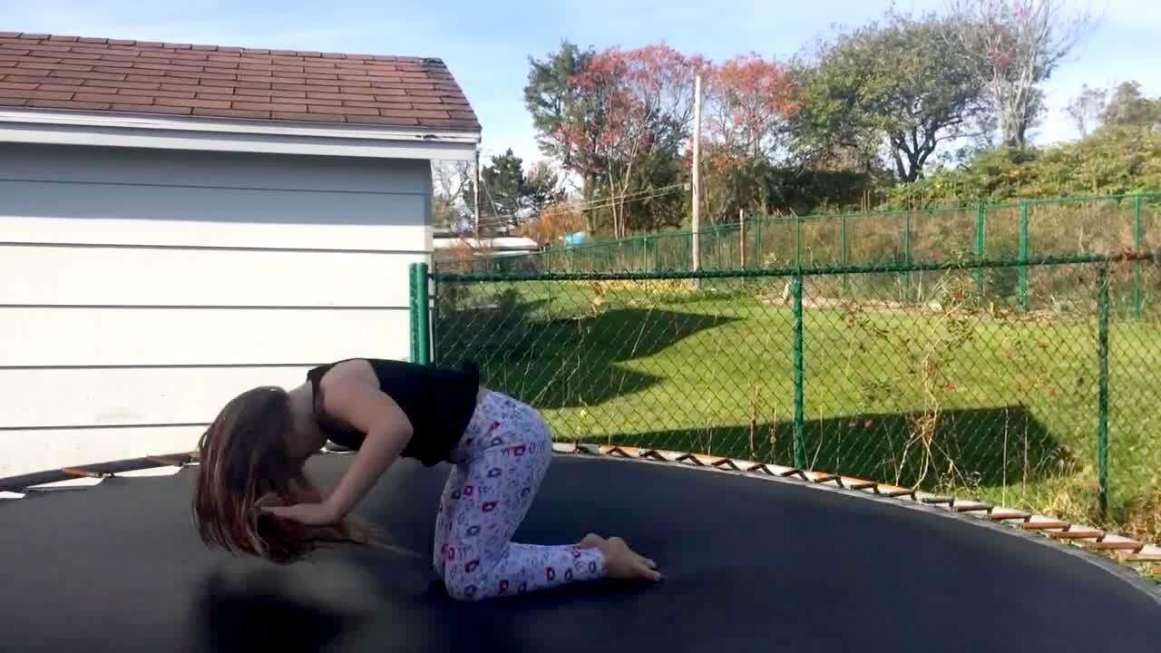 A teen girl opens a door and a fur hat falls on her and she screams outdoors.