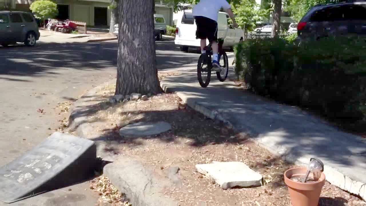 Boy rides his bike over a ramp in his backyard, lands on his front wheel & falls forward over the handlebars. No recovery.