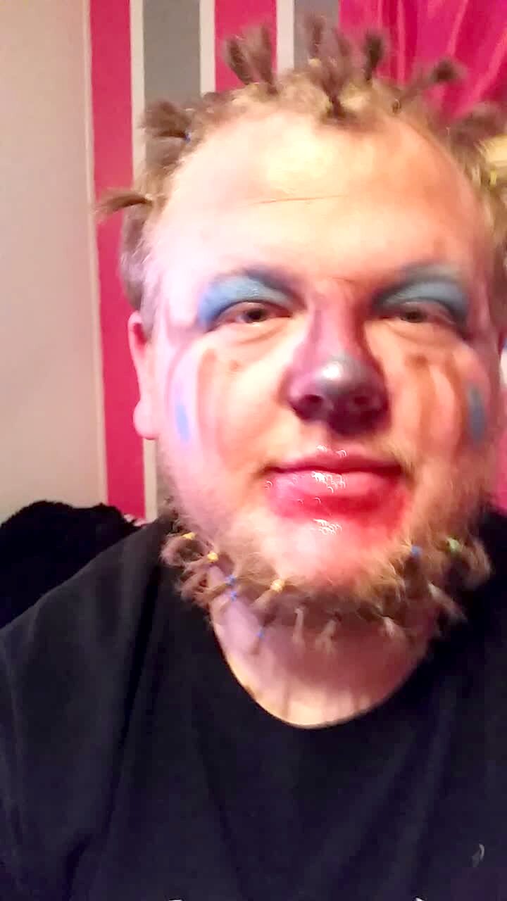 A man wears lipstick and rainbow fake eyelashes and struggles to open his eyes. AA: Makeup your dad.