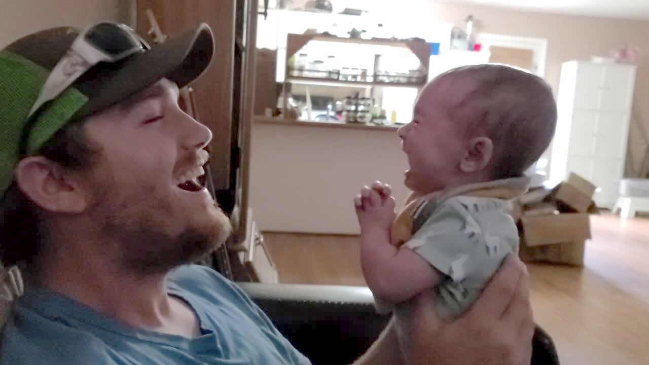 A baby girl looks at herself in the reflection of sunglasses on her uncle's hat. Every time the man looks at her and she can't see the sunglasses, she cries.