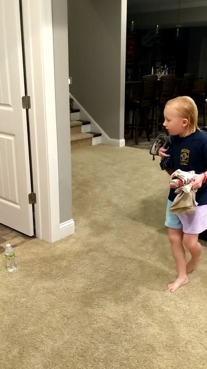 A man pranked a young girl about running water with water bottles coming out of the bathroom.