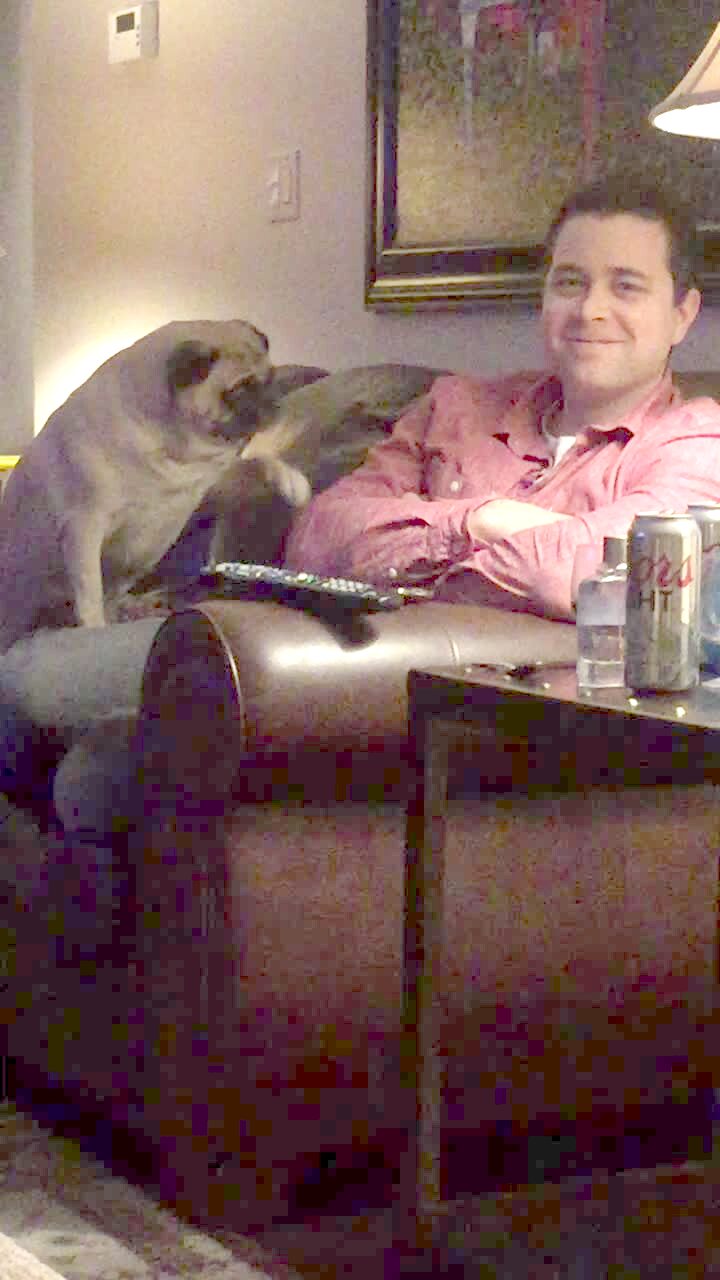 A girl holds a dog with fake eyelashes on his face while she and her mom laugh hysterically.