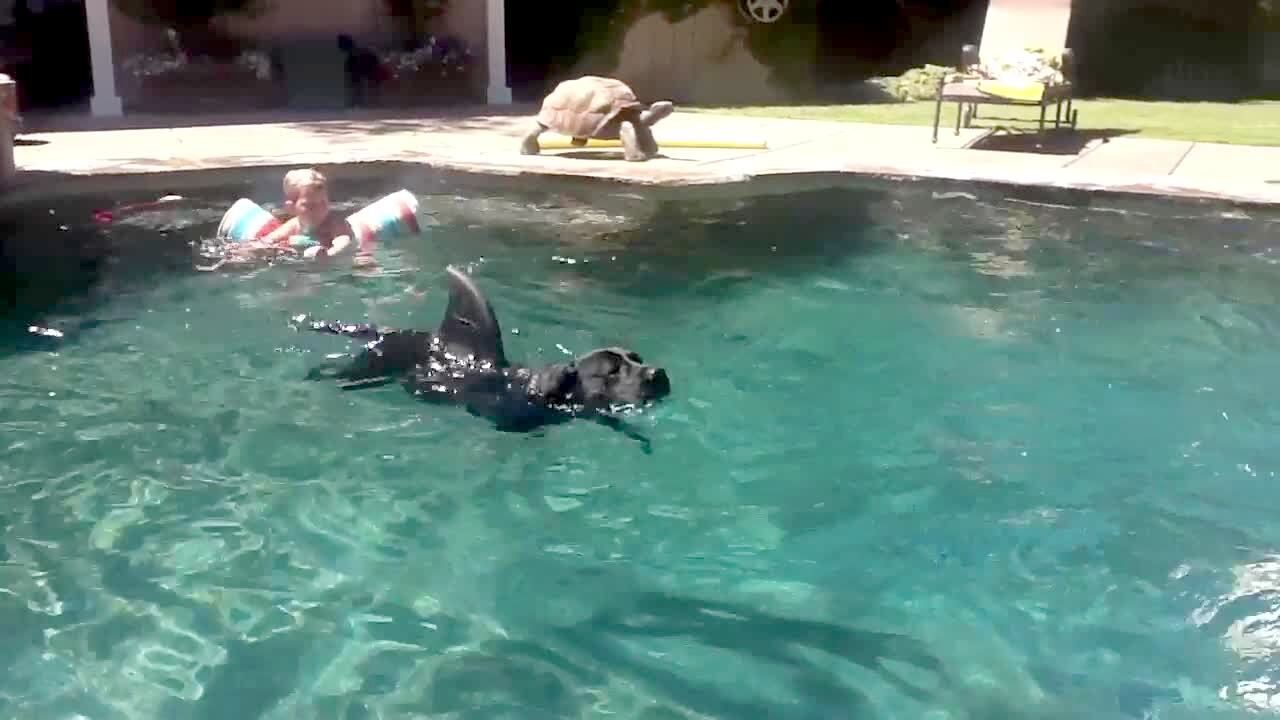A small puppy dog walks along the edge of an inflatable pool to reach her doggie pool. Action starts at 1:25.