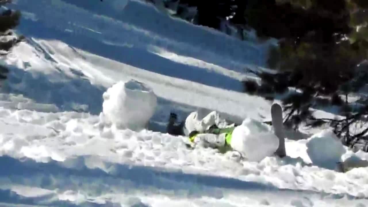 Man goes off a big drop while skiing, his skis get stuck in the snow & man falls down the mountain toward the camera. Shaky camera. With recovery. Winter.