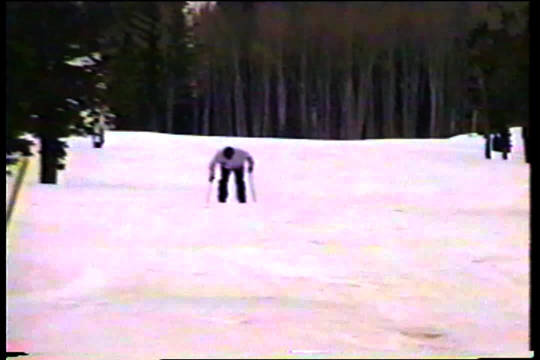 At night, two men swing another man down a small hill and he slides on a hand railing on his skis, he slips, falls, and lands hard on his crotch. Groin hit. Profanity.
