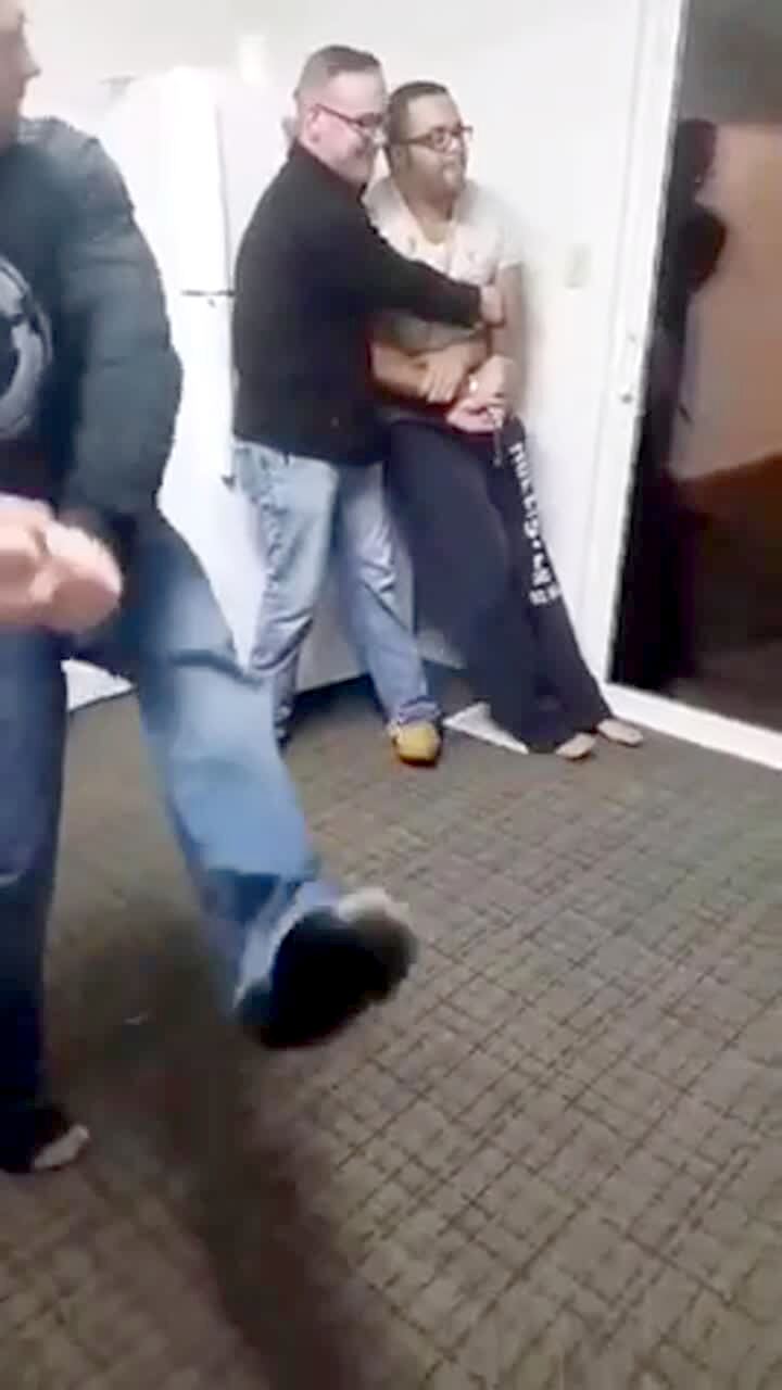 A man uses a pull up bar in a door frame. The frame partially breaks and the man falls.