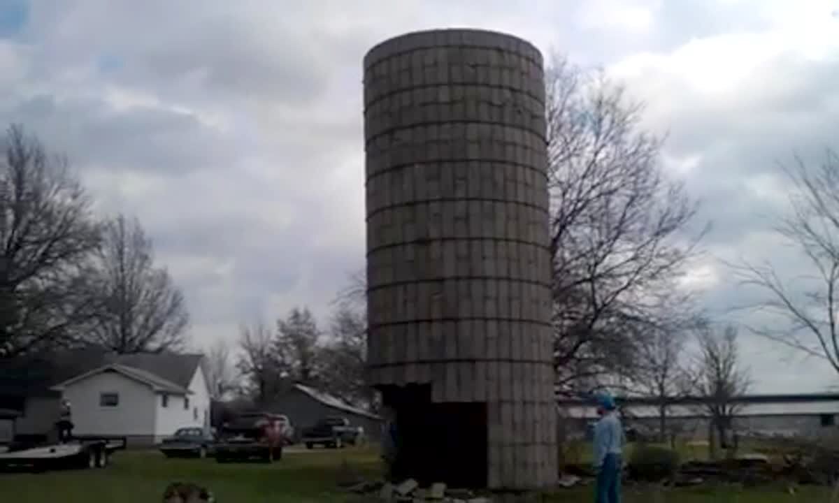 A man chops down an old silo like a tree outdoors on a windy day. The entire thing collapses and nearly crushes the man.