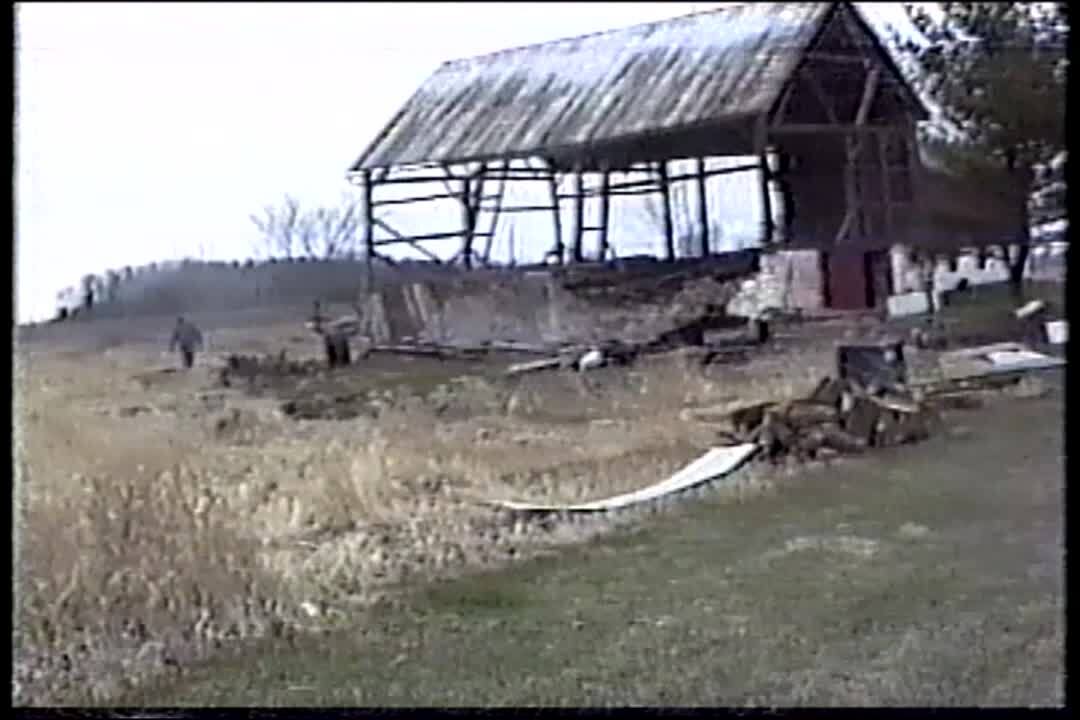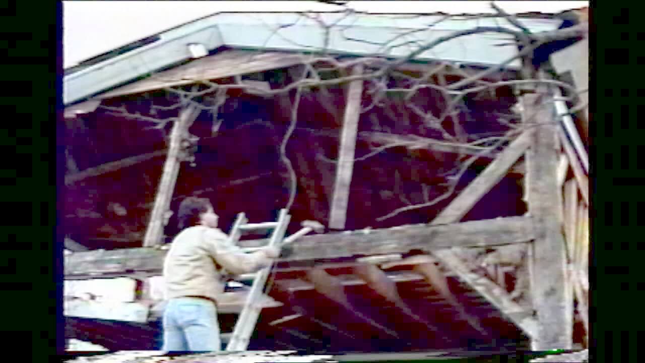 Man pulls on dilapidated barn frame and runs when it all collapses. Work. Home improvement.