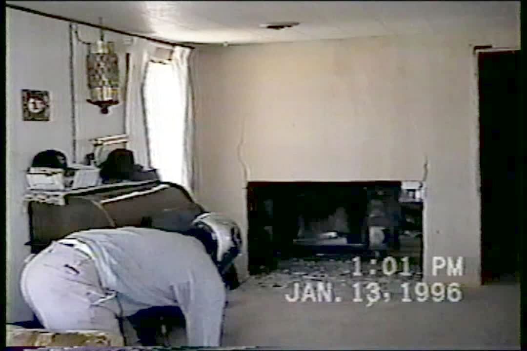A man uses a hammer to knock masonry off of a fireplace in a living room. Then many of the stones fall down at once and knock him over.