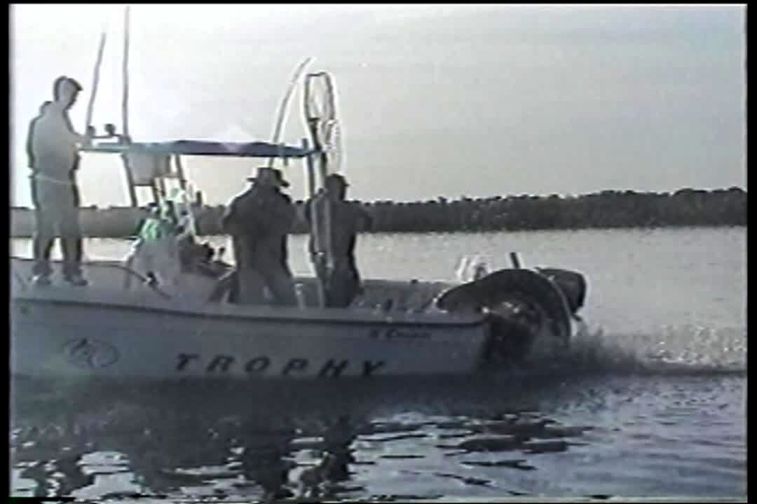 "Fish Out Of Water" Huge fish jumps out of water and hits man in a boat. we see later the fish pooped on the man. Fish jumping in background as well