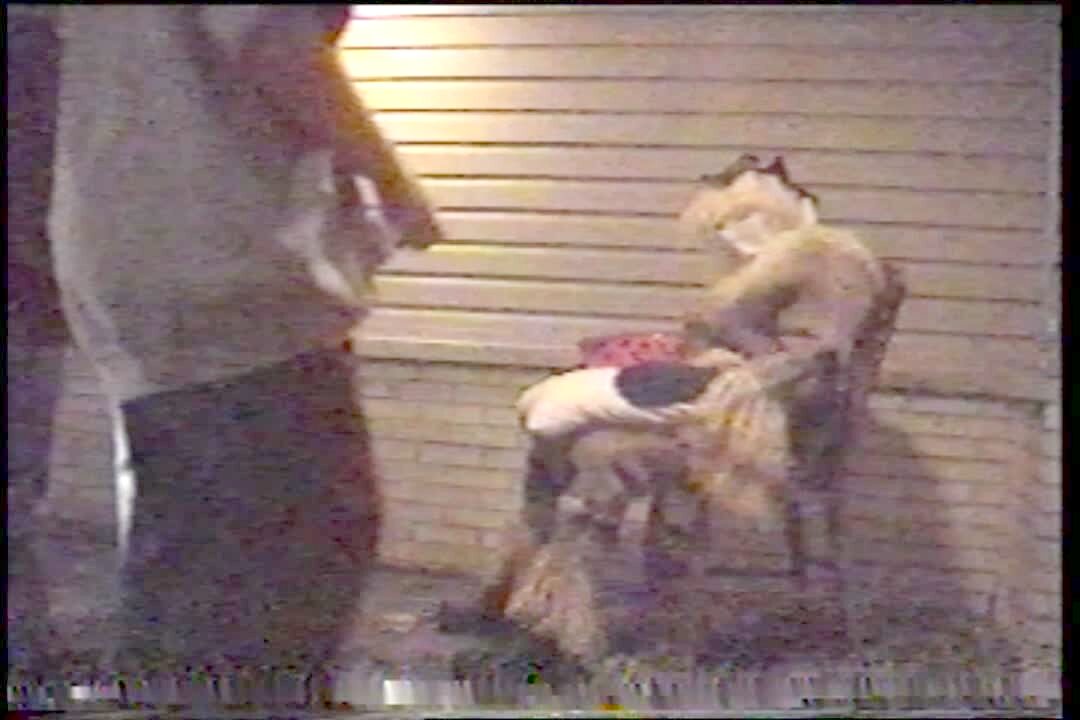 A talking mechanical scarecrow Halloween decoration sits in a lawn chair on the front porch of a house, with a censor on the doorstep, to activate it. A young girl in an inflatable costume trick-or-treats, and walks to the house. The scarecrow jumps and screams, and the girl screams and runs from the house. Secondary source, from home security camera.