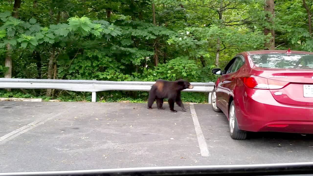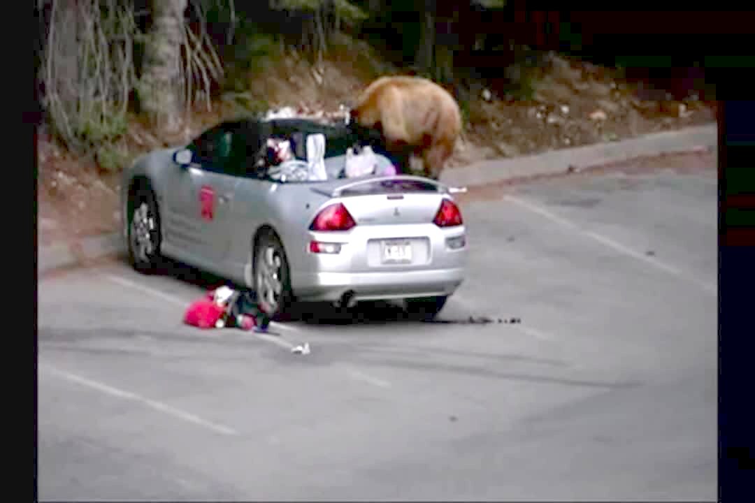 A person drives a car in a parking lot and stops in front of another car parked in a spot. They honk their horn at the car and a bear climbs out the window with something in its mouth.