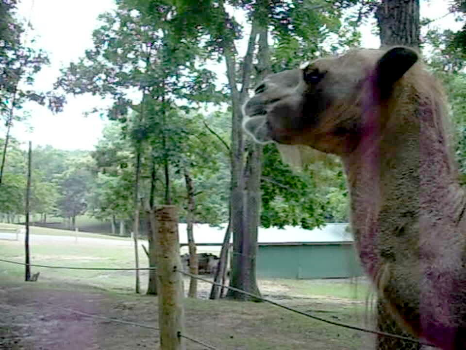 A camel sticks his head into a car and grabs a plastic food bucket. He eats the contents but then starts to chomp on the bucket itself.