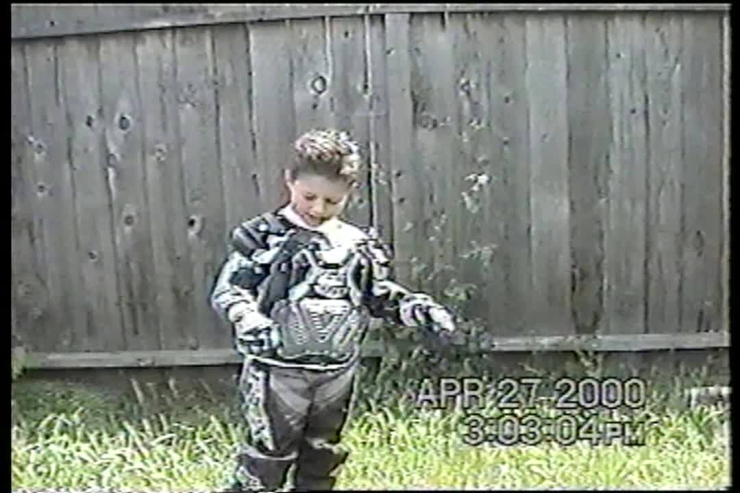 Young boy rides ATV / 4 wheeler for 1st time & drives into the fence. He falls down. With recovery.