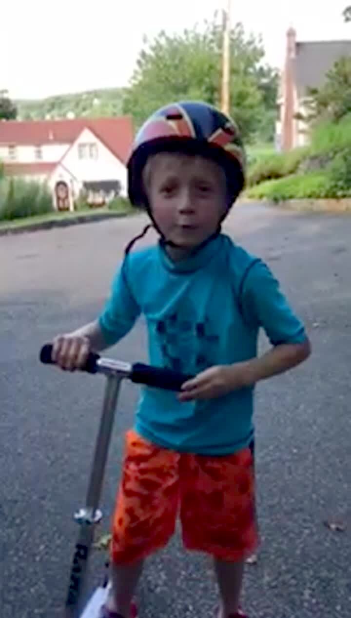 Kid on big wheel bike topples down hill