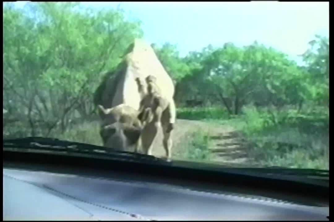 Camel runs after car in drive through zoo. Woman keeps screaming her husband's name.