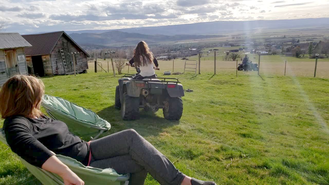 A teen girl drives a four-wheeler quad ATV and crashes it into a gate on a farm.