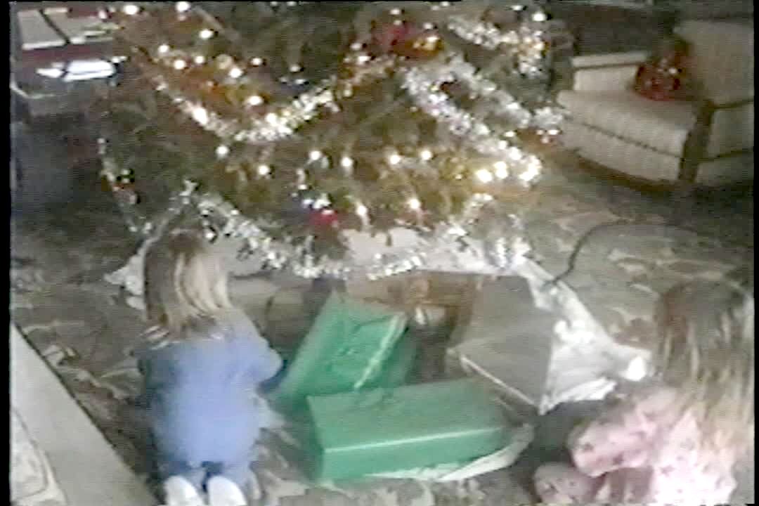 Tot girl drives toy jeep into Christmas tree, knocking it over.