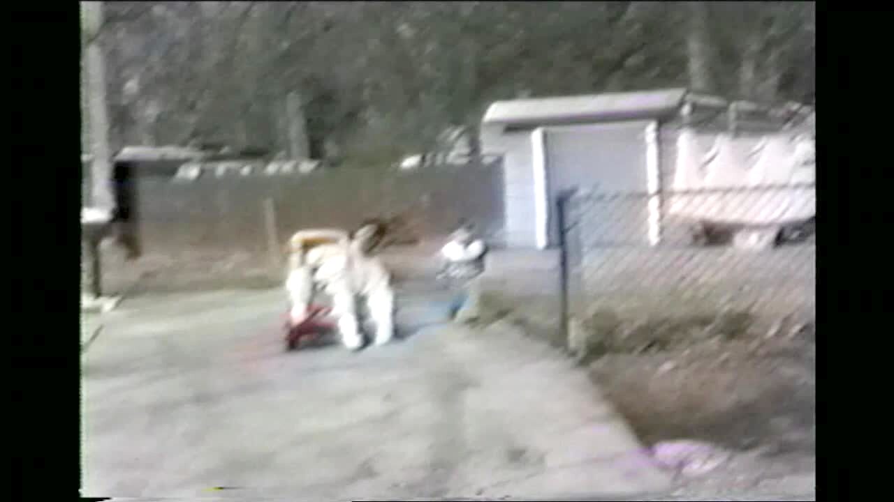 Mom In Kiddie Car. Mom goes down driveway hill and flips and falls on face