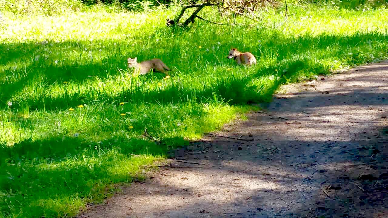 A young boy falls off of a dock on a lake backwards while preparing to run and jump off of the other side outdoors.