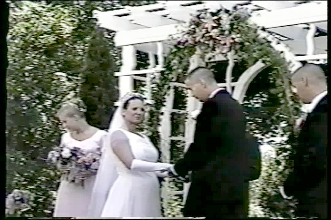 Bride & groom are saying vows when a large pillar falls on the bride. She catches it & pushes it up, 2nd pillar falls on groom. Long for edit, good recovery. Wedding ceremony.