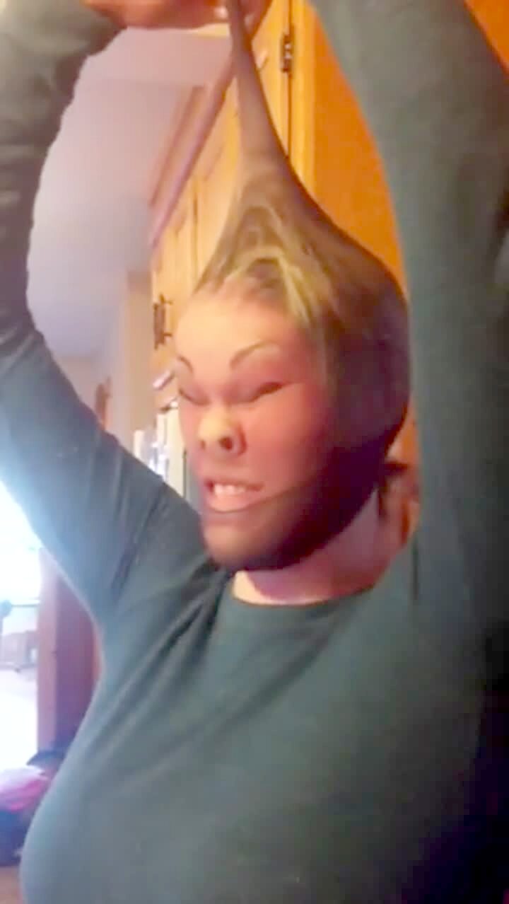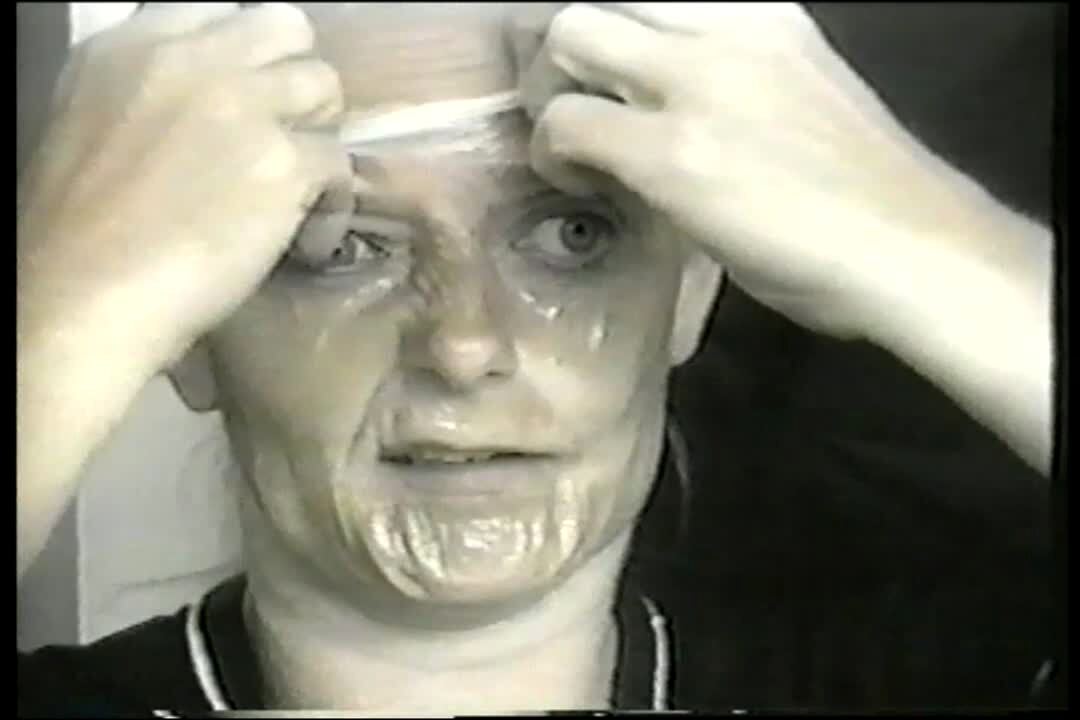 A woman makes funny faces while struggling to pull a nylon stocking off of her face. A kid says she looks like a pig off screen, she pulls it off, and laughs.