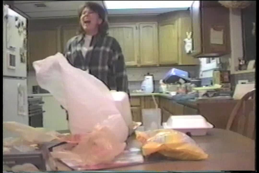 Practical joke - Mouse in woman's Styrofoam food box scares her
