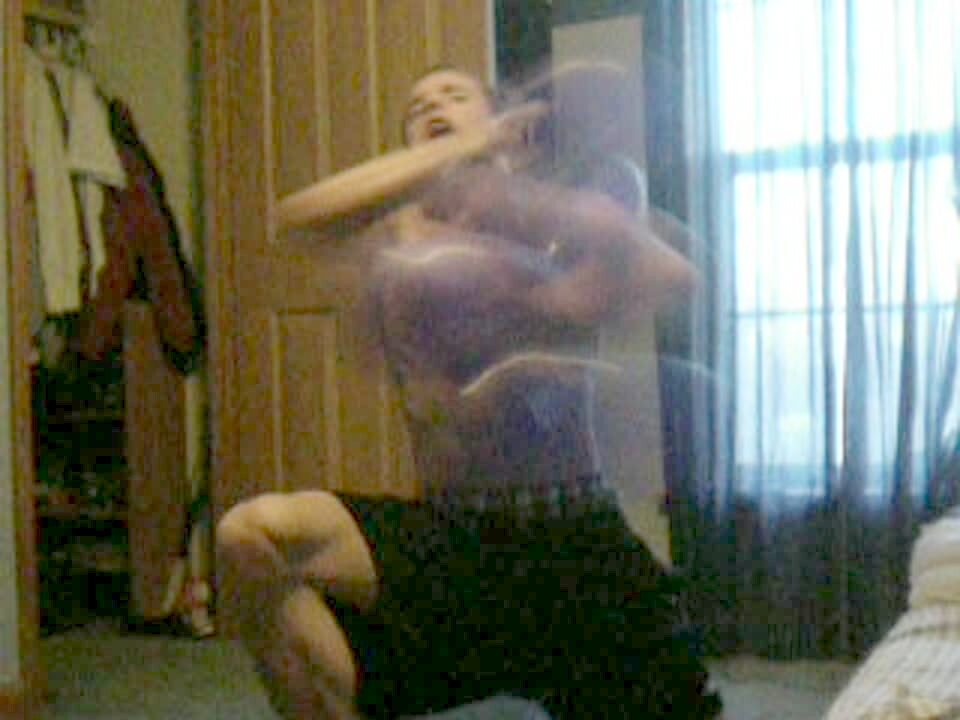A woman dances on a stripper pole at home, but the pole comes down, and she falls.