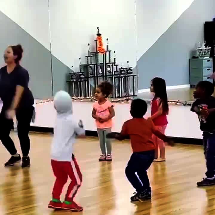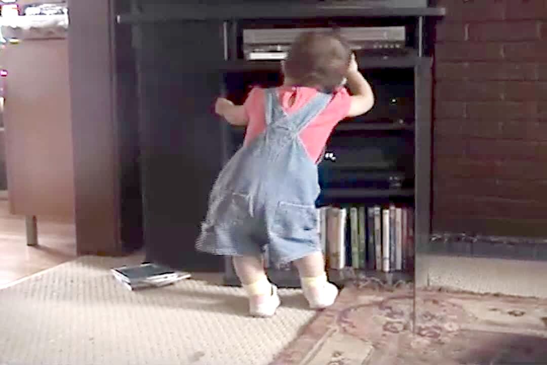 Tot girl runs into living room, turns on stereo to oldies tune, dances and shakes butt in time to music.
