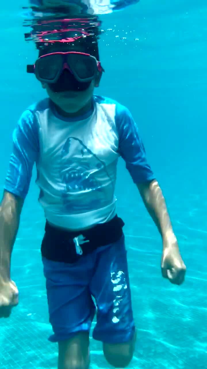 A young boy does the floss dance underwater as he swims in a pool in the backyard.