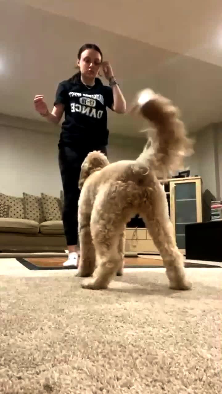 A teen girl tries to record a tap dance routine in the living room, but her dog runs in circles around her instead.