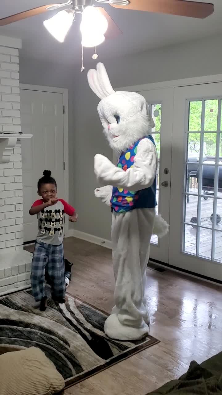 A young boy dances to "Renegade" with a man dressed as an Easter bunny in the living room.