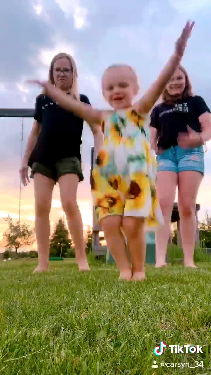 Two young girls and a tot girl dance in a backyard to rap music, then the tot girl walks in front of the camera and dances very dramatically. TikTok.