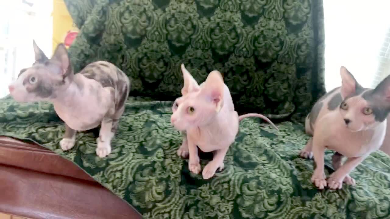 Three hairless cats move their heads side to side in unison as they follow a cat toy and it looks like they are dancing to the music.
