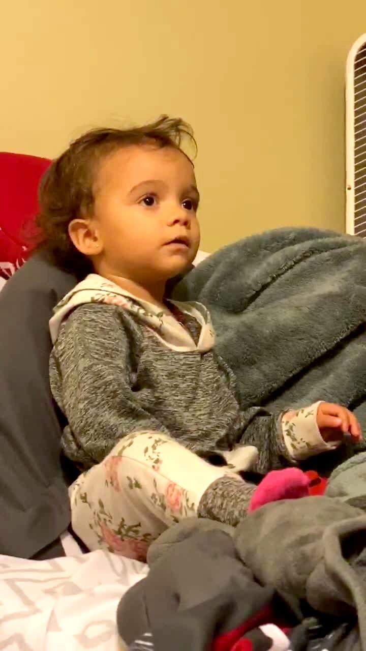 A baby girl on a bed makes a funny face when she hears a trumpet. Her facial expressions imitate the sound of the trumpet.