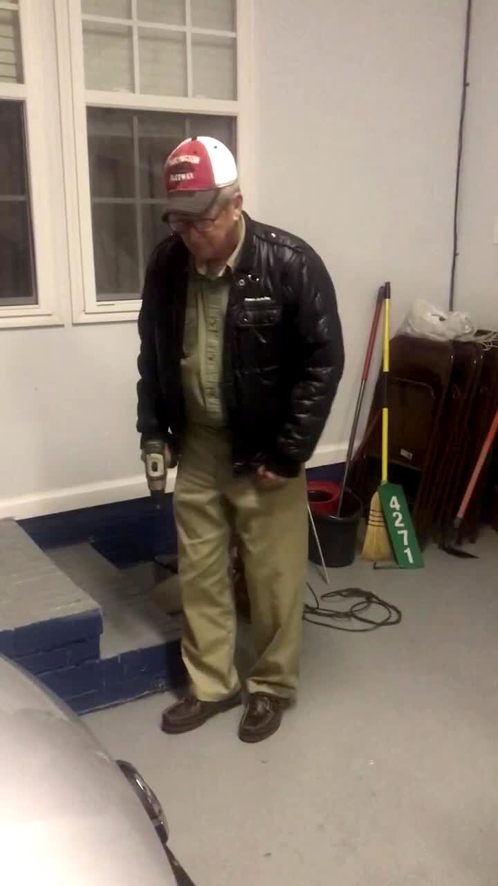 A senior man uses a power drill to make noises while he does the robot dance in the garage.