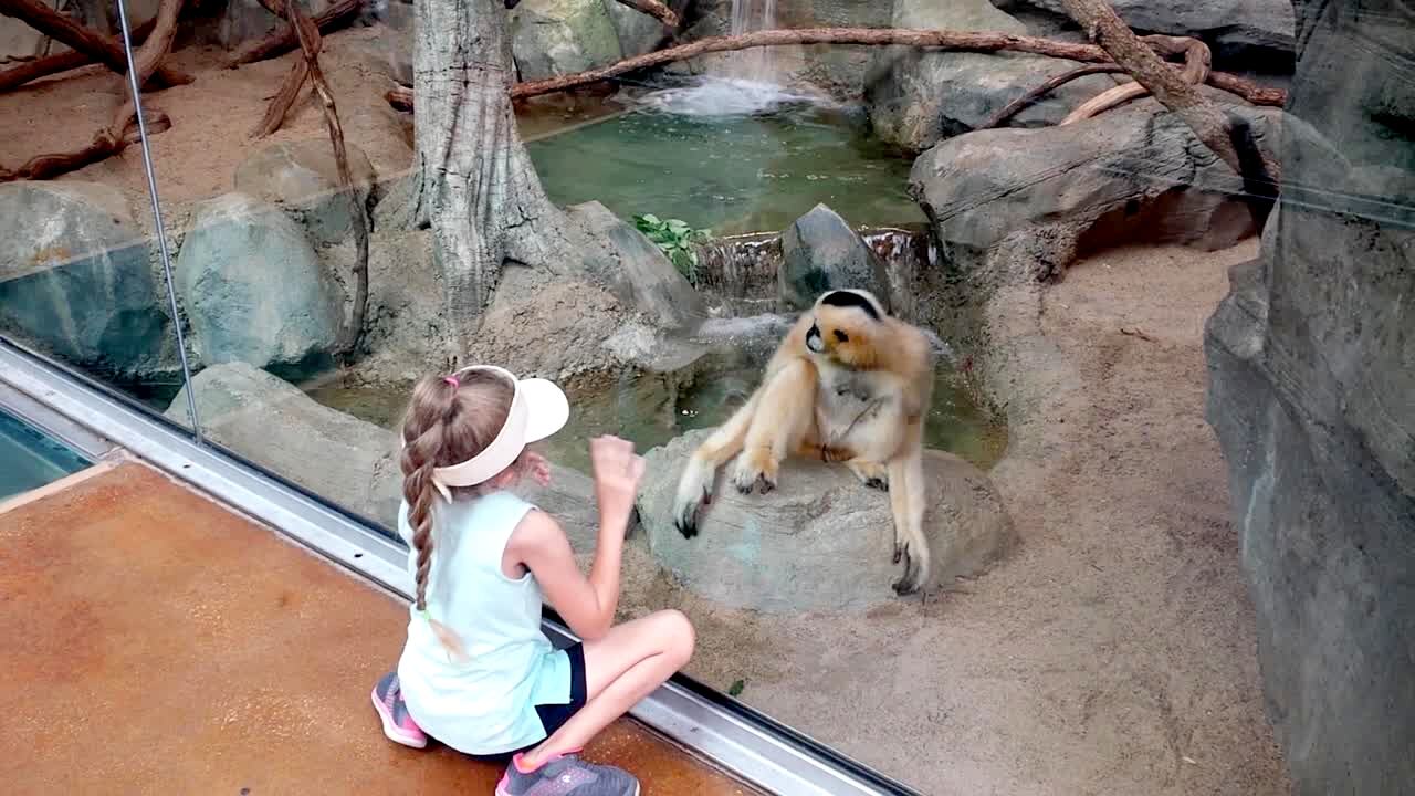 A young girl jumps around a monkey enclosure at a zoo and the monkey jumps at the glass.