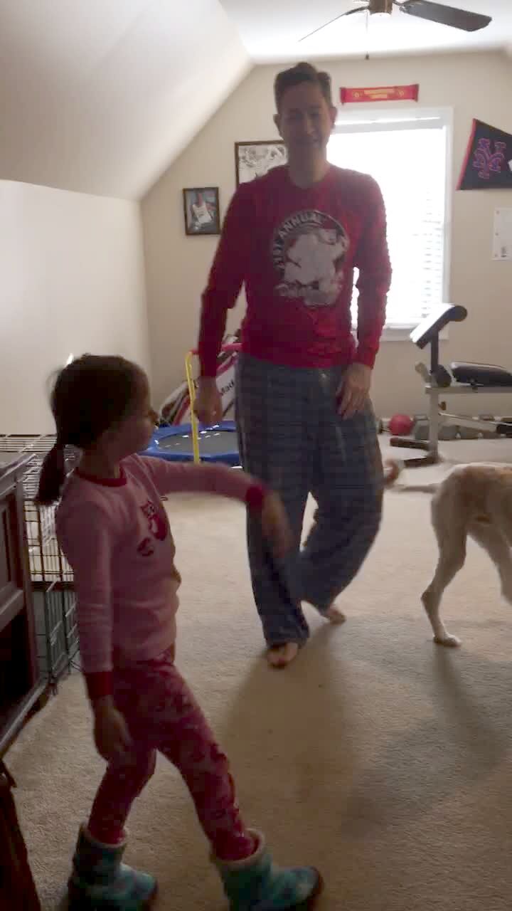 A man and a young girl dance together in a bedroom and at 0:57, a dog comes between them and stands up on its back legs to dance with the man.