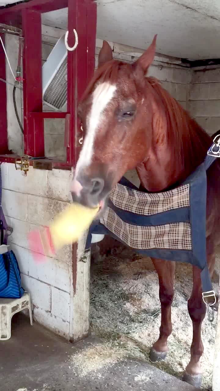 A horse nods its head while it holds a rubber chicken that squeaks in its mouth.