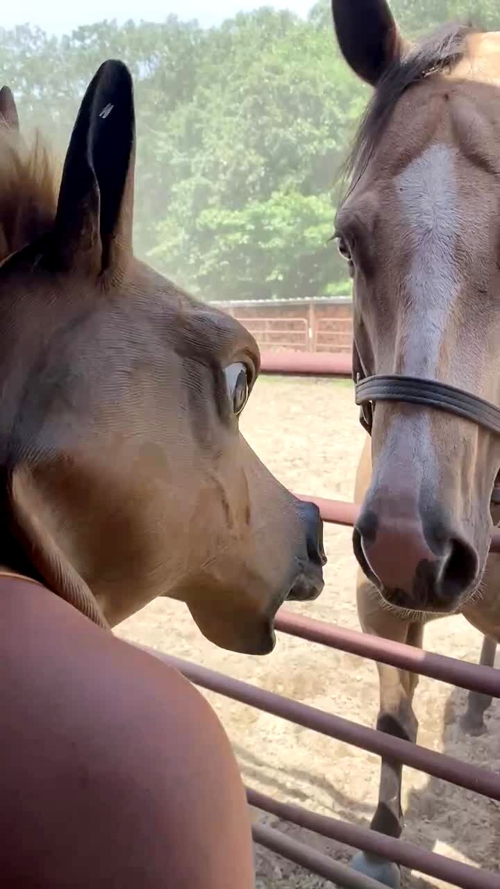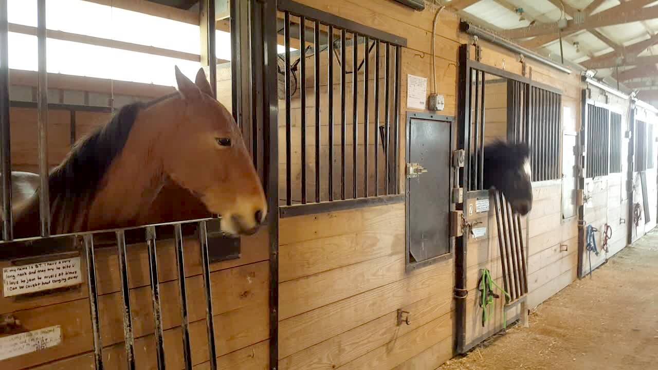 A woman wears a horse mask at a stable and neighs at real horses. One horse stares at her then she snorts and it runs away.