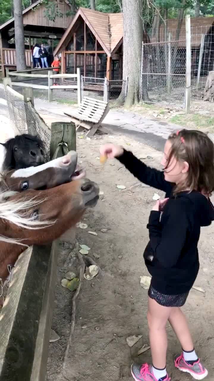 A young girl at a petting zoo holds out some food for some horses. When the horses open their mouths the girl's dad sings so it makes it look like the horses are singing.