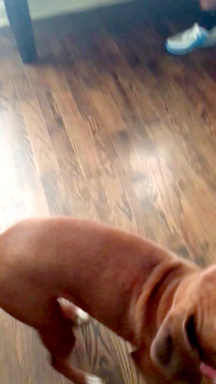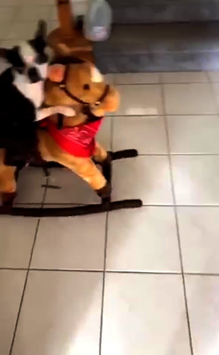 A man opens a front door and inside the house is a Boston Terrier riding on the back of a rocking horse to Old Town Road (music rights not included).