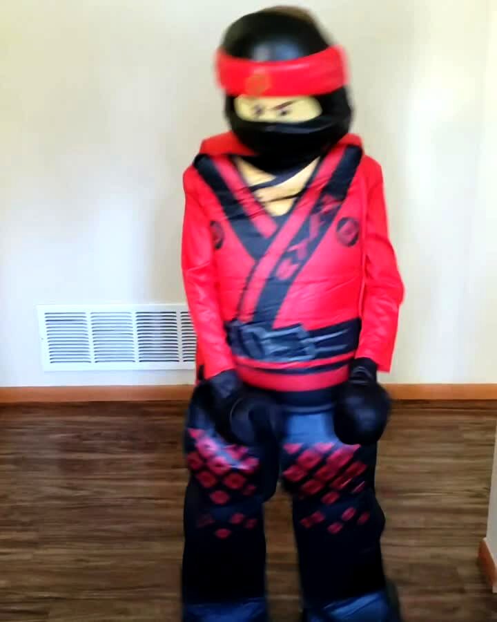 A young boy dances to music in a Ninja LEGO costume in a kitchen and at the end a large dog walks between his legs and trips him over and he falls down.